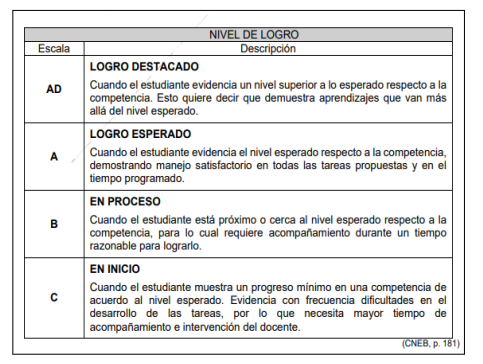 ✓ Para valorar el nivel de logro alcanzado en el proceso de desarrollo de la competencia hasta ese momento se usará, en toda la Educación Básica, la escala valorativa tal como se establece